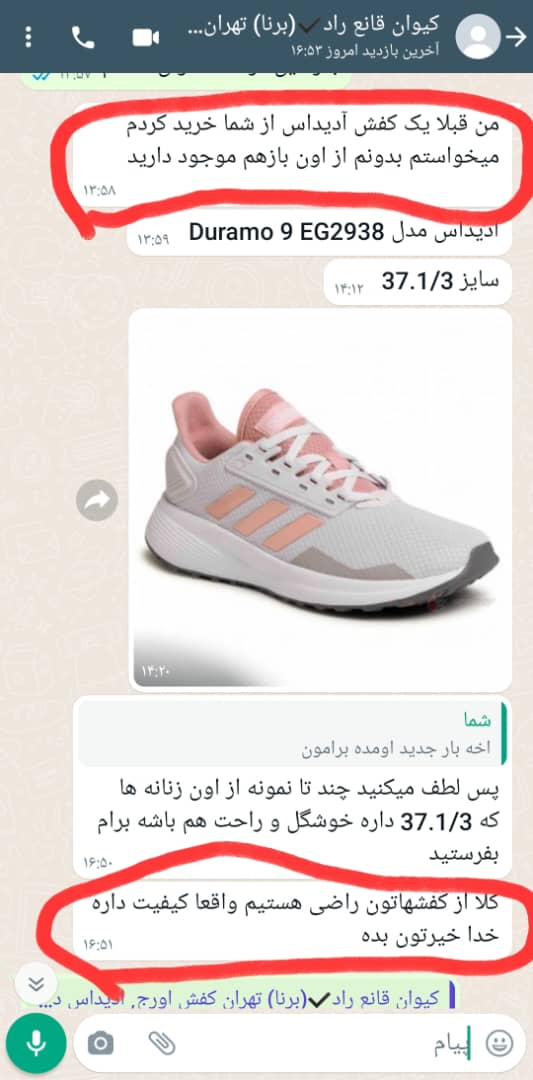 من قبلا یک کفش آدیداس از شما خرید کردم می خواستم بدونم از اون باز هم موجود دارید. کلا از کفشهاتون راضی هستیم واقعا کیفیت داره. خدا خیرتون بده.