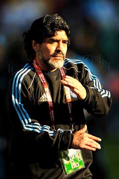 در نوامبر ۲۰۰۸ وی به عنوان سرمربی تیم ملی آرژانتین منصوب شد. در جام جهانی ۲۰۱۰ آفریقای جنوبی وی هدایت تیم ملی آرژانتین را بعده داشت. تیم آرژانتین در این جام کلکسیونی از بهترینهای جهان را در اختیار داشت و به اعتقاد بسیاری از منتقدین اتخاذ تاکتیکهای غلط از سوی مارادونا باعث شد تا این تیم نتواند جام را فتح کند. آرژانتین در مرحله مقدماتی جام جهانی ۲۰۱۰ با قدرت تمام تیمهای نیجریه(۱–۰)، کره جنوبی (۴–۱) و یونان (۲–۰) را شکست داد و با امتیازات کامل راهی مرحله یکهشتم نهایی شد. در این مرحله نیز مکزیک را با نتیجه ۳ بر ۱ شکست داد اما در مرحله یک چهارم نهایی در برابر آلمان شکست تحقیر آمیز ۴ بر ۰ را متحمل شد و از گردونه رقابتها خارج شد و رؤیای مارادونا برای دستیابی به قهرمانی جهان در کسوت مربی بر باد رفت. هرچند در بازگشت به آرژانتین وی با استقبال بسیار گسترده هواداران آرژانتینی مواجه شد اما پس از جام جهانی با وجود تمام حمایتهای مردمی وی از سرمربیگری آرژانتین کنار گذاشته شد.