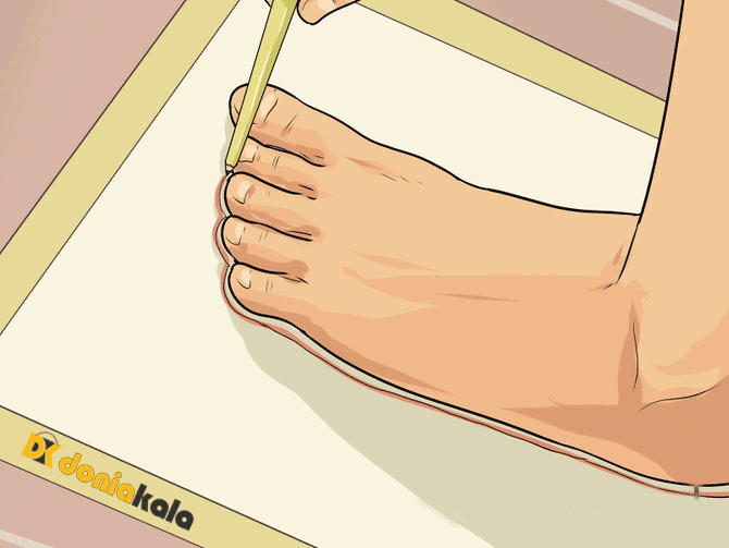 اندازه ی هردو پا را بگیرید، یادتون باشه معمولا یک پامون بزرگتر از پای دیگریه! سعی کنید این کار را آخر روز انجام دهید چون اون موقع پا گرم و منبسط شده است. اگر کسی کمکتون میکند، روی یک کاغذ بایستید و ازش بخواهید دورتادور پایتان را با کمترین فاصله خط بکشد. بعد از روی طرحاتون، طول پاشنه تا بزرگترین انگشت رو اندازه بگیرید. حالا اندازه ی طول پایتان را به سانتی متر میدانید و شاید متوجه شوید که یک پاتون واقعا از دیگری بزرگتر است!