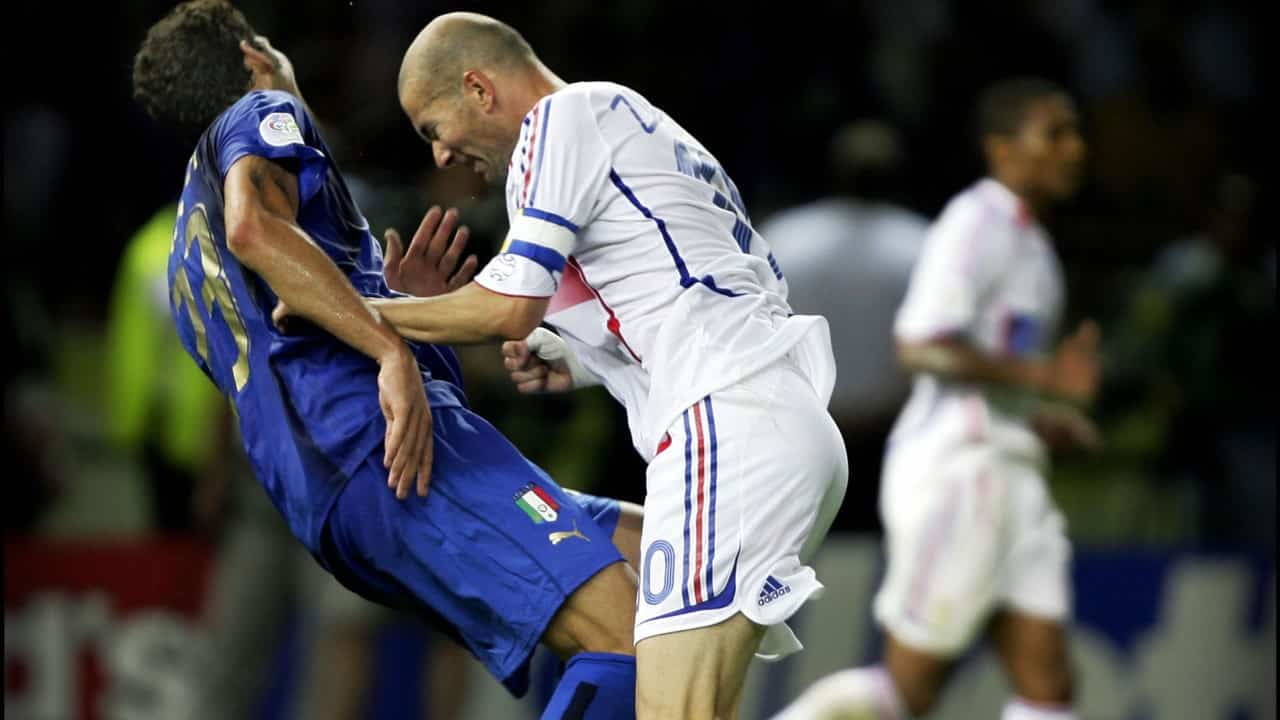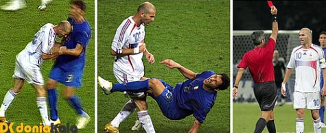 در دقیقهٔ ۱۱۰ بازی فینال، زیدان در صحنهای بدون توپ با سر به سینه مارکو ماتراتزی ضربه زد. زمینهٔ این درگیری کلماتی بود که ماتراتزی به زیدان گفته بود (در پایین توضیح داده شدهاست). داور بازی، هوراشیو الیزوندو، این صحنه را ندیده بود اما لوئیس مدینا کانتالخو، داور چهارم، صحنه را گزارش کرد تا زیدان با دریافت کارت قرمز از بازی اخراج شود. او بازوبند کاپیتانی را به ویلی سانیول سپرد تا او آن را به بازوی فابین بارتز ببندد و از زمین خارج شد.