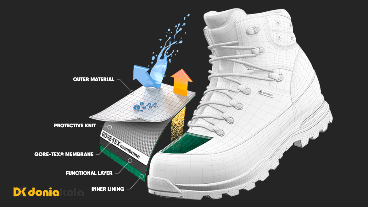 Gore-Tex در واقع یک برند اختصاصی غشاء ضد آب است که از دهه 1960 در صدر نوآوری ها قرار داشته است. این غشای مجهز به میلیاردها منفذ میکروسکوپی است که به طور ویژه برای محافظت حداکثر و قابلیت تنفس طراحی شده است. این نخستین پارچه تنفس، ضد آب و ضد باد بود و وقتی در دهه 1970 به جامعه معرفی شد، سر و صدای زیادی به پا کرد. این تضمین می کند که شما را خشک نگه می دارد. قول می دهم "دلیل آن این است که همه از اسکی بازان و پیاده روی کنندگان گرفته تا پزشکان برای محصولات خود به آن متوسل می شوند. وقتی پارچه های Gore-Tex را در یک کفش مشاهده می کنید ، می توانید اطمینان داشته باشید که کفش تحت شرایط شدید آزمایش قرار داشته است.