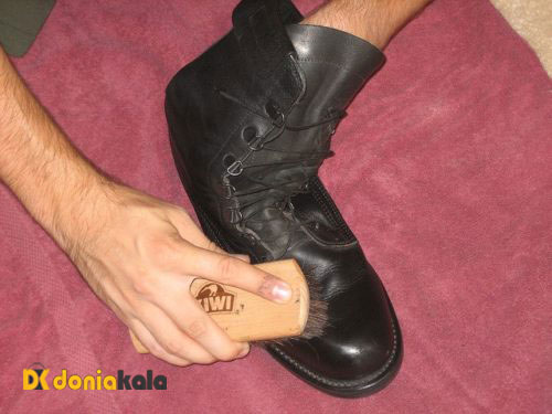 3. با استفاده از برس پولیش کفش، کل کفش را با مقدار زیادی پولیش بپوشانید. پولیشی که من از آن استفاده می کنم، پولیش Kiwi Shoe Polish است، اما حتما رنگ پولیش را تا حد امکان، با کفش خود مطابقت دهید. اطمینان حاصل کنید که درزهای پایین کفش از مواد پوشیده شده و سعی کنید به طور یکسان آن را با پولیش بپوشانید. بگذارید پولیش 15 دقیقه بماند تا خشک شود.
