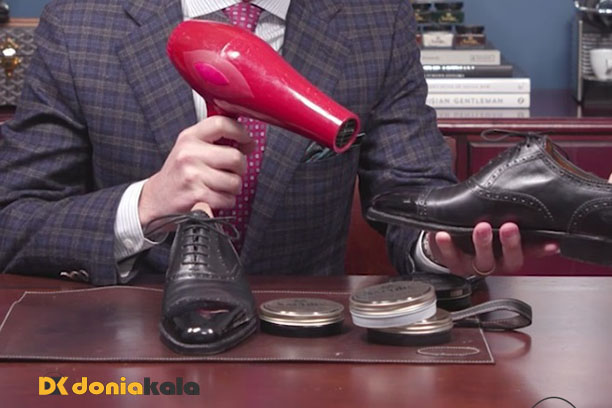 سپس باید قسمت خیس شده را خشک کرده سشوار را به اندازه 20 سانتی متر از کفش فاصله داده وبا استفاده از این کار کفش را خشک کرده مواظب باشید، گرما بیش از حد نباشد که به کفش اسیب برساند. شما برای این مرحله میتوان بجای سشوار کفش را زیر گرمای آفتاب قرار داد با این که بیشتر وقت میبرد ولی ما به شما روش دوم را بیشتر پیشنهاد میکنیم .