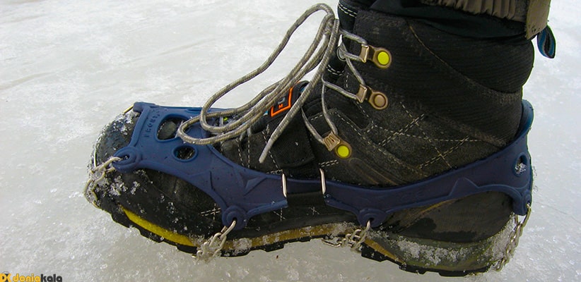 کفشهای کوهنوردی غالبا به شکلی طراحی شدهاند که با کرامپون قابل استفاده باشند و برای این کار، حاشیهها به سمت انگشتان و پاشنه قالبریزی شدهاند که جای خوبی برای اتصال کرامپونها ایجاد میکند. سفتی کفش، دقت کرامپون را بالا میبرد و به فرد اجازه میدهد در شرایط دشوارتر و شیبهای زیاد نیز گام بردارد.