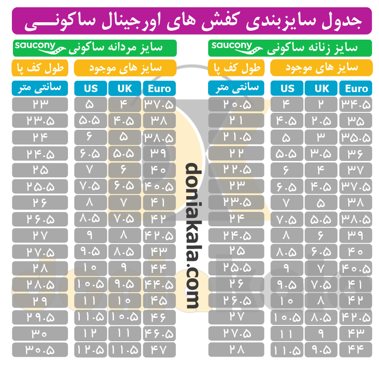 جدول سایزبندی کفش و کتونی اورجینال ساکونی (ساکُنی) saucony آمریکا: