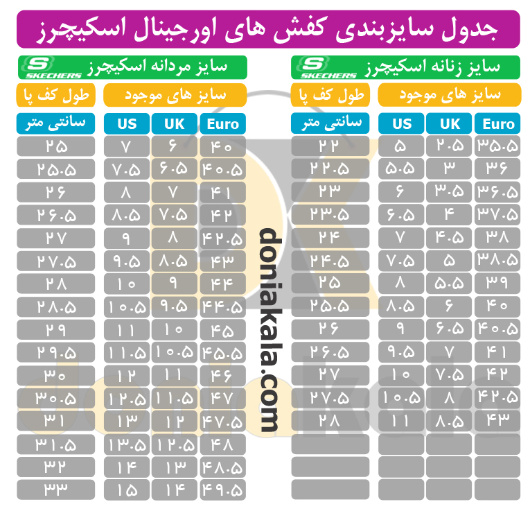 جدول سایزبندی کفش و کتونی اورجینال اسکیچرز/ اسکچرز skechers آمریکا: