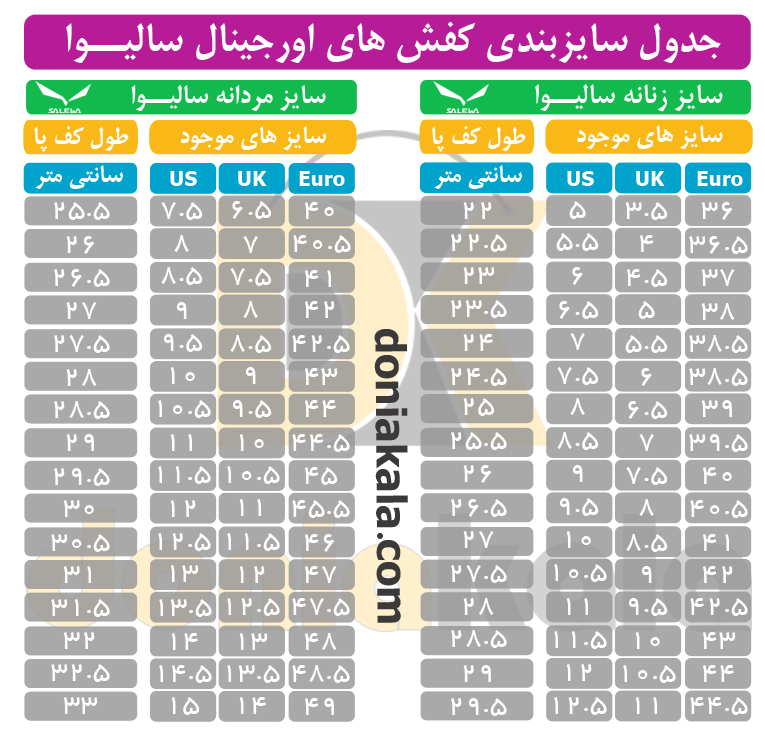 جدول سایزبندی کتونی های اورجینال، کفش کوهنوردی و صحرانوردی سالیوا saliwa ایتالیا:
