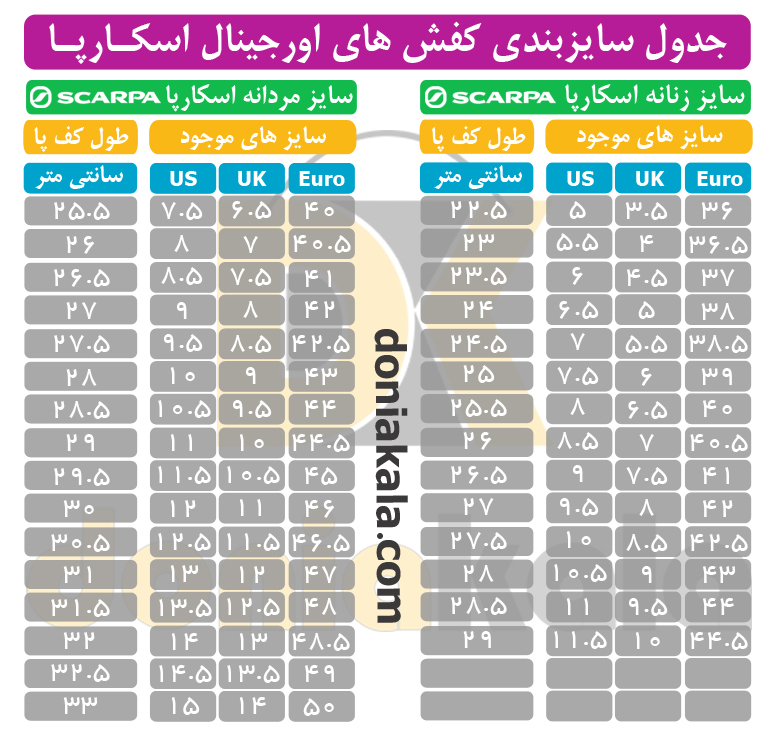 جدول سایزبندی کتونی های اورجینال، کفش کوهنوردی و صحرانوردی اسکارپا scarpa ایتالیا :