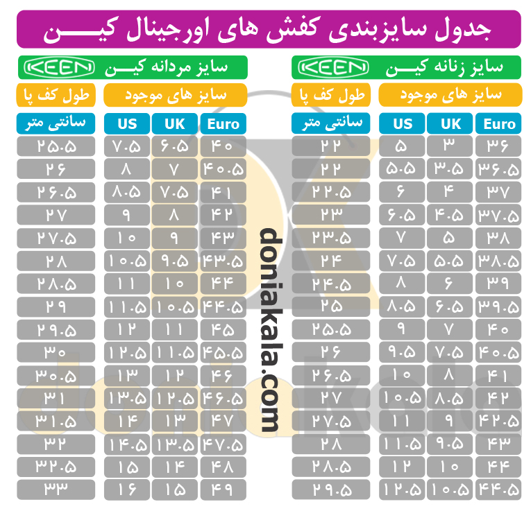 جدول سایزبندی و نحوه اندازه گیری سایز پا برای کتونی های اورجینال، کفش کوهنوردی و صحرانوردی کین KEEN آمریکا
