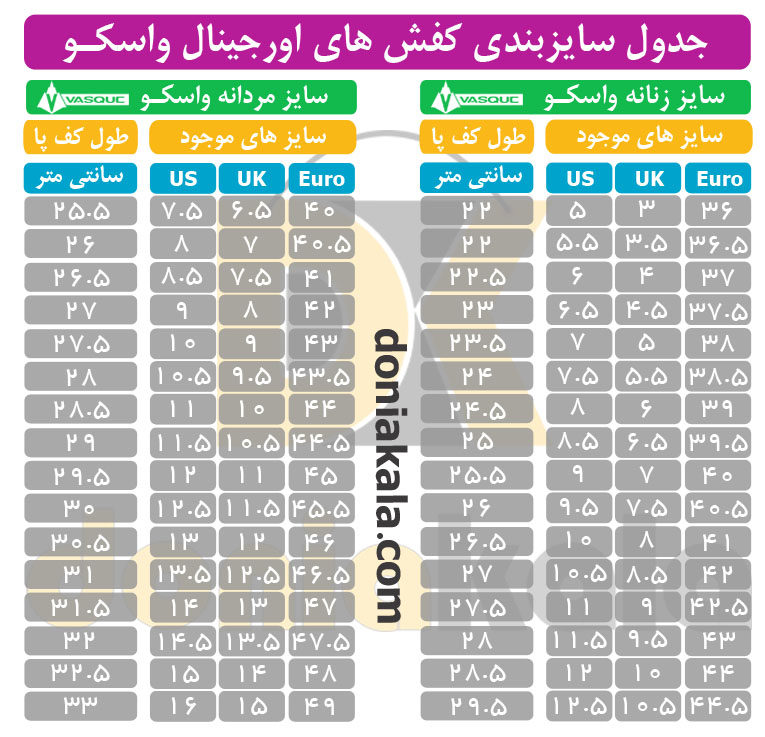 جدول سایزبندی کتونی های اورجینال، کفش کوهنوردی و صحرانوردی واسکو vasque آمریکا: