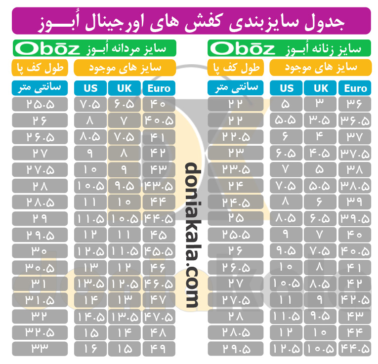 جدول سایزبندی کتونی اورجینال، کفش کوهنوردی و صحرانوردی اُبوز oboz آمریکا: