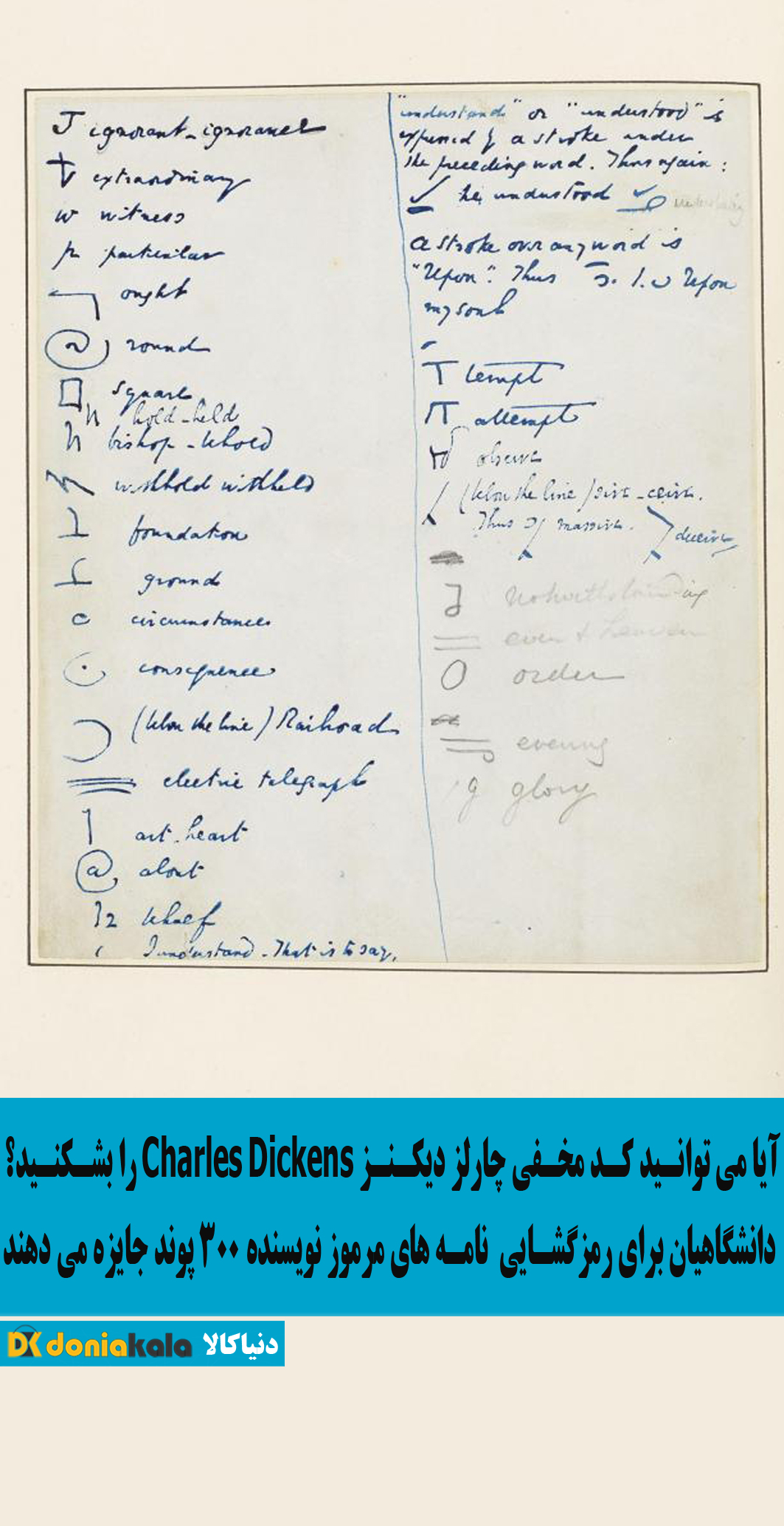 آیا می توانید کد مخفی چارلز دیکنز Charles Dickens را بشکنید؟ دانشگاهیان برای رمزگشایی نامه های مرموز این نویسنده 300 پوند جایزه می دهند. به اصطلاح "نامه تاویستوک" 'Tavistock letter' در خلاصه نویسی شخصی چارلز دیکنز Charles Dickens نوشته شده است، نامه یکی از آخرین دست نوشته های بازمانده از دیکنز Dickens است اما هرگز خوانده نشده است زیرا هیچ کس موفق به رمزگشایی رمز نویسنده نشده است. اکنون دانشگاه های لستر و فوجا Leicester and Foggia universities از مردم خواسته اند تا این کد را حل کنند.