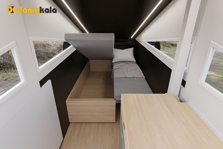 یک ویدیوی رندر شده از طراحی نشان میدهد که پیوست باز شده و از بستر کامیون خارج میشود. سایبان های نایلونی چادر مانند از دو طرف وسیله نقلیه بیرون می آیند و فضای ایوان را ایجاد می کنند. در داخل، تخت، که دارای فضای ذخیره سازی مخفی است، بسته به سلیقه کاربر می تواند به یک یا دو نفره تبدیل شود. افراد کمپینگ camping روی یک تشک مموری فوم می خوابند که زیر سقف طاق دار خوابیده اند. کمپر دارای دوش نبیا و یک توالت کاست جمع و جور است که دارای مخزن قابل حمل است. فضای توالت با یک پرده از بقیه قسمت های کمپر جدا می شود و در صورت عدم استفاده، قسمت توالت به یک نیمکت بالشتکی تبدیل می شود.