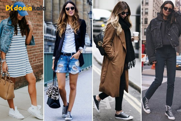 میتوانید کانورس Converse خود را با شلوار جین و تیشرت T-shirt، ژاکت یا تاپ زیبا بپوشید تا یک لباس راحت و غیررسمی داشته باشید. کانورس Converse مشکی کلاسیک با انواع تکهها عالی به نظر میرسد، اما شلوار جین تنگ و تاپهای ساده با کفشهای کتانی، کتونی کمحجم راحت هستند. وقتی میخواهید لباس بپوشید، بهتر است کفشهایتان را به تاپهای بلند ارتقا دهید و کفشهایتان را با شلوار جین قدبلند و یک پیراهن فلانل، کراپ یا پیراهن طرحدار ست کنید. برخی از خانمها ممکن است بخواهند یک پیراهن با یک ژاکت جین، یک شلوار جین با یک پیراهن باندی جذاب و یک کت دوچرخهسواری چرمی یا یک لباس زیبا با جورابهای بدون نمایش را در نظر بگیرند تا ظاهر خود را به سطح بالاتری برسانند. کفشهای کتانی، کتونی کانورس Converse در رنگهای مختلفی مانند طرحهای صورتی یا گلدار هستند که به خوبی با سارافون ست میشوند و تعادلی از اسپرت و زنانه را فراهم میکنند که خانمهای شیک دوست دارند. برای ایجاد یک ظاهر گاه به گاه هوشمند، میتوانید به سراغ کتهای سرمهای با دکمههای طلایی و لباسهای خاکی لاغر بروید. با استفاده از این لباس شیک، می توانید در روزهای سردتر یک یقه یقه اسکی بافتنی با رنگ خاکی یا یک پیراهن مجلسی ابریشمی جذاب در تابستان انتخاب کنید.