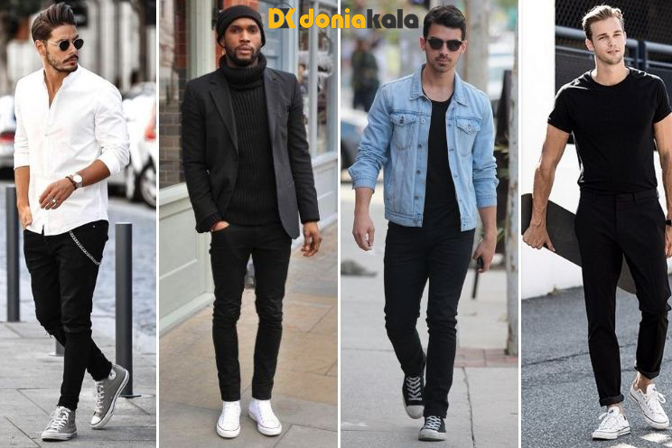برخی از مردان شیک، چاک تیلور Chuck Taylor را با یک تی شرت T-shirt مناسب و شلوار جین باریک می پوشند، زیرا این فرم های غیر رسمی معمولاً با طراحی تنگ و سیلوئت کفش مطابقت دارند. بسته به مناسبت، میتوانید چاکهای خود را با شلوارک یا شلوار و یک ژاکت یا هودی گشاد با یک کت باری بلند مدل دهید. برای داشتن لباسی شیک میتوانید در طول روز یا در باشگاه بپوشید، کفشهای کتانی، کتونی کانورس Converse روپوش مشکی را با جورابهای بدون نمایش امتحان کنید. کفشهایتان را با شلوار جین مشکی با کاف، یک پیراهن سفید سبک بافته شده بلند، یک کت پیراهن جین آبی باریک یا یک کت چرمی ست کنید.