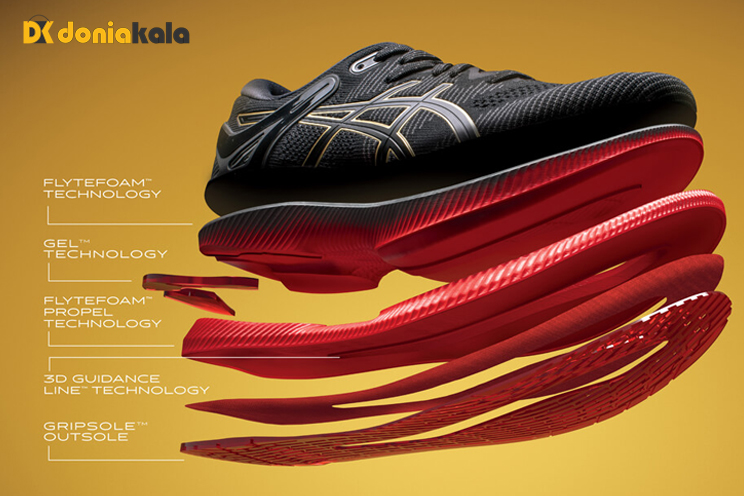 مواد زیره میانی فلای فوم FLYTEFOAM همچنین باید سطح بالایی از بازیابی انرژی داشته باشد و در ارتباط با گاید سول GUIDESOLE، (فناوری گاید سول Guidesole چیست؟ فناوری تی ام گاید سول GUIDESOLE™ با طراحی نوآورانه زیره راکر Rocker ساخته شده است. یک لایه سفتتر از فناوری فلای فوم لایت FLYTEFOAM® Lyte باعث ایجاد بالشتک و ساختار میشود، در حالی که لایه دوم فناوری فلای فوم پراپل FLYTEFOAM® Propel حسی نرم و درخشنده به کف کفش میدهد. در پاشنه، فناوری ژل GEL® باعث بهبود بالشتک در هنگام ضربه پا می شود) فشار وارده بر مفاصل را کاهش داده و راندمان دویدن را افزایش دهد.