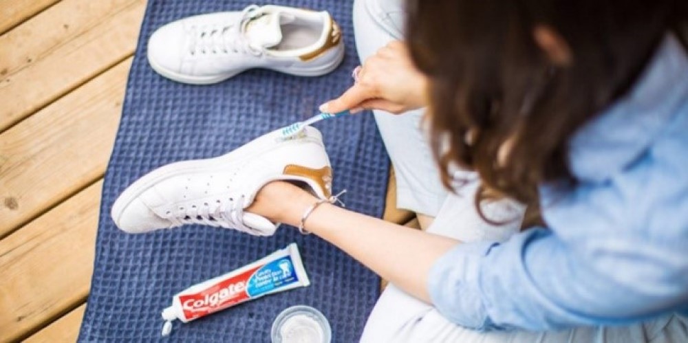خمیر دندان (ترجیحاً بدون ژل رنگی و حاوی جوش شیرین) برای تمیز کردن لاستیک زیره و قسمتهای پلاستیکی کفش معجزه میکند.