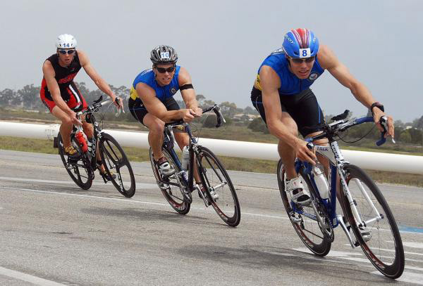 دوچرخهسواری: دوچرخهی مناسب (جاده یا ترایاتلون)، کلاه ایمنی (اجباری)، کفشهای دوچرخهسواری (که اغلب در T1 روی دوچرخه نصب میشوند) و عینک آفتابی.