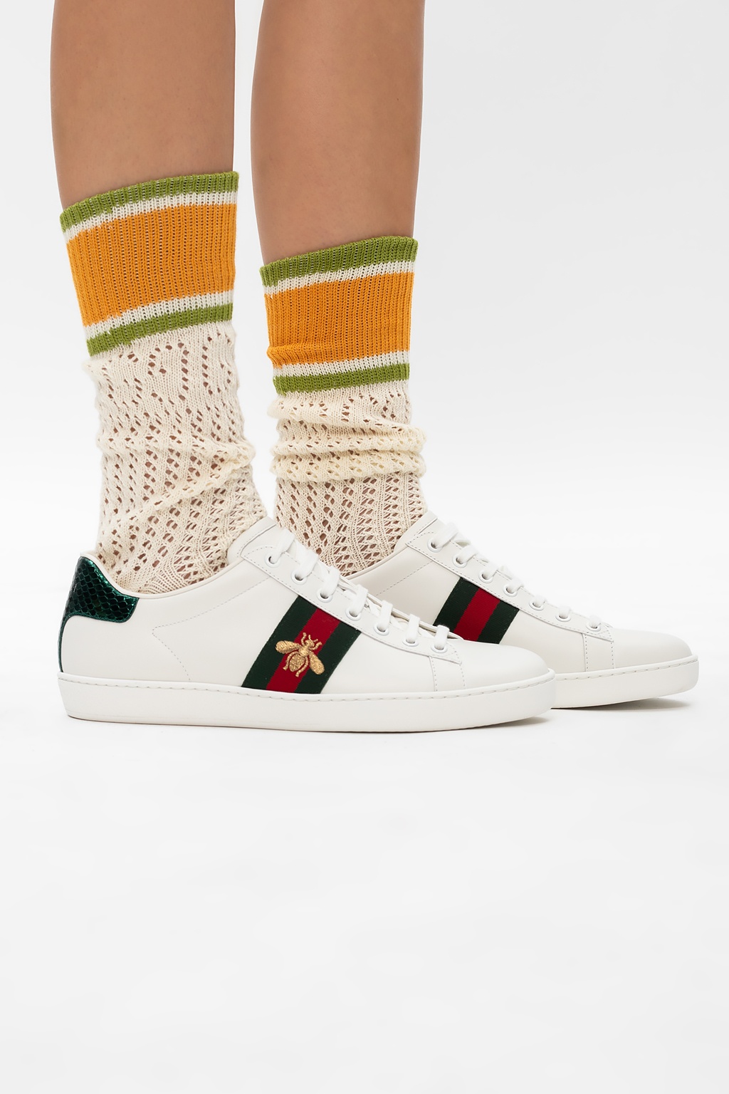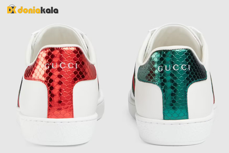 کفش چرمی کلاسیک مجلسی | روزمره |پیاده روی | مدل گوچی اسنیکر ایس ویس بی Gucci Sneaker Ace With Bee 431942 02JP0 9064 | مشخصات محصول: کفشهای کتانی کلاسیک مجلسی با زنبور دوزی طلایی در مقابل شبکه سبز و قرمز تزئین شده است. زنبور عسل یک کد آرشیوی است که برای اولین بار در لباس های آماده گوچی در دهه 1970 معرفی شد. طراحی شده با چرم سفید ـ کفش لاستیکی ـ کفشهای کتانی توری «Ace» از گوچی. این طرح چرم که با نوار وب سبز-قرمز-سبز نمادین برچسب همراه با زنبور دوزی در طرفین تزیین شده است، دارای افکت پوست مار سبز متالیک با آرم روی پاشنه و زیره لاستیکی سفید در پایه است.