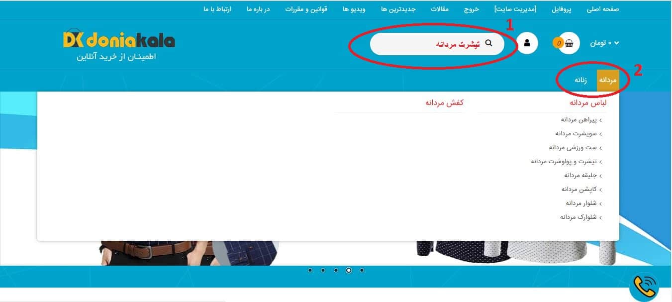 2 - در روش دوم میتوانید بر روی منوی تعیین شده ( مردانه، زنانه ) و انتخاب نوع محصول خود وارد صفحه مورد نظر شده و اجناس را مشاهده کنید .