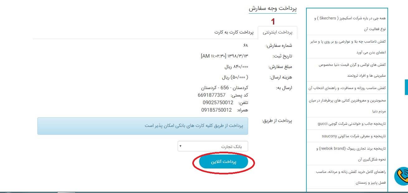 این روش که آسان ترین و مطمئن ترین روش پرداختی برای شما مشتریان گرامی است با مطالعه دوباره آدرس و شماره تلفن خودتان در پایین گزینه پرداخت انلاین رو بزنید و وراد صفحه درگاه پرداخت اینترنتی بانک تجارت شوید، آنجا با وراد کردن شماره کارت و رمز دوم اینترنتی و سایر مشخصات کارت می توانید خرید خود را به پایان برسانید.