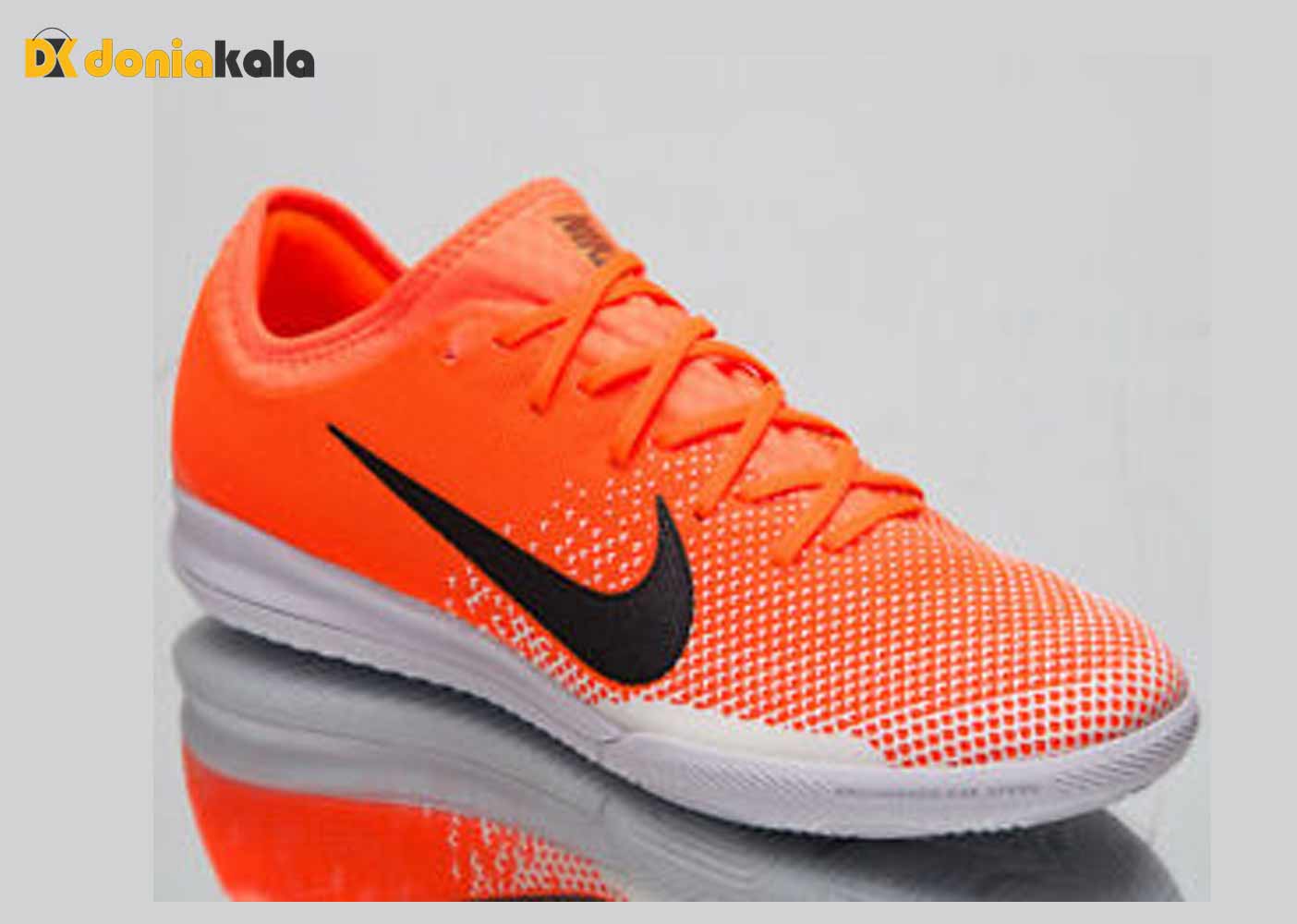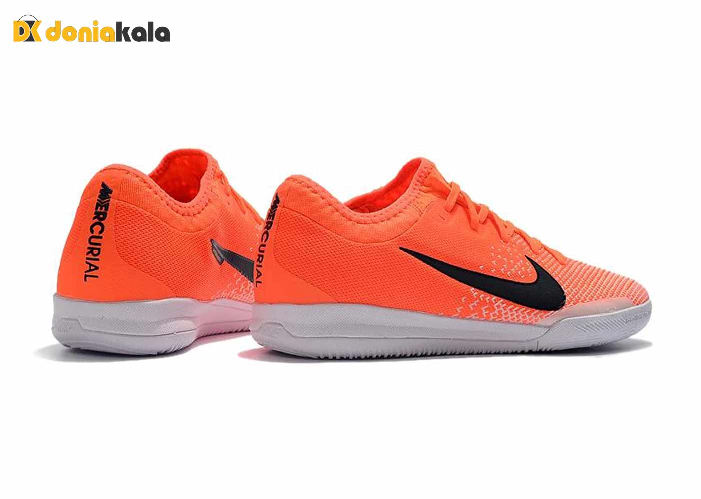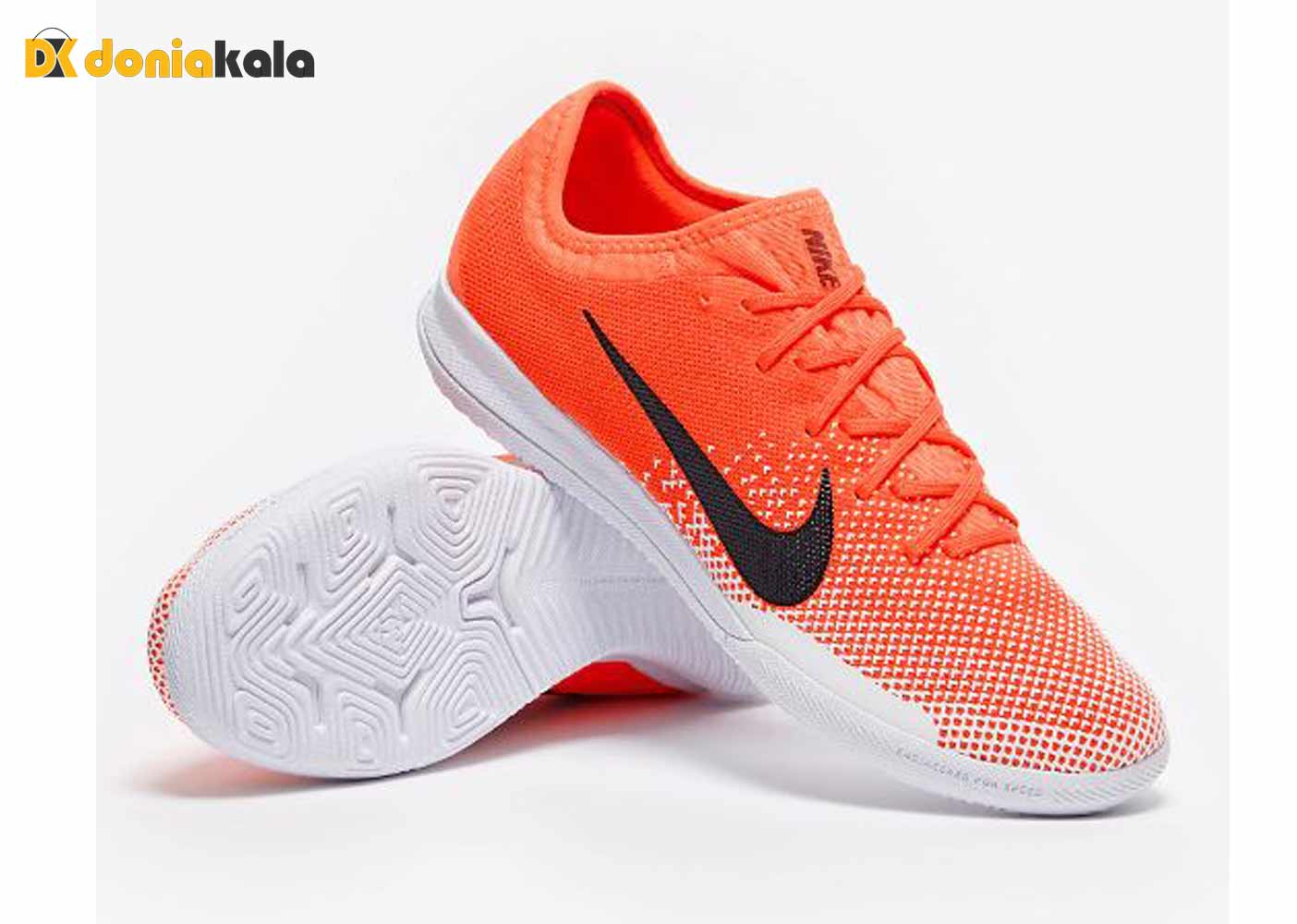 کفش فوتسال سالنی مردانه نایک مرکوریال ویپور بسیار شیک و زیبا با طرحی فوق العاده. رویه این کتونی از الیاف مصنوعی رویه پارچه ای مش که استحکام زیادی دارد ساخته شده است. دارای کفی نرم و انعطاف پذیری است که پا را اصلا اذیت نمیکند و برای جلوگیری از دردهای مفصلی بسیار عالی است. زیره آن از جنس EVA می باشد و به گونه ای طراحی شده است که از لغزندگی و پیچ خوردن پا جلوگیری میکند و از فناوری نایک گریپ NikeGrip که برای چسبندگی بیشتر کفه کفش و جلوگیری از لغزش است استفاده شده است. همچنین فناوری فلی کینت FlyKnit به کار رفته که باعث ایجاد چسبندگی عالی توپ به کفش می شود.