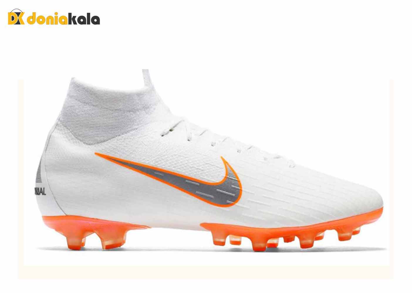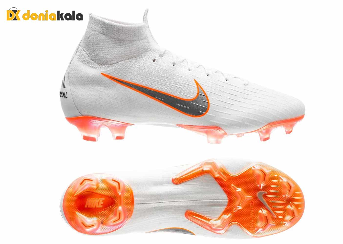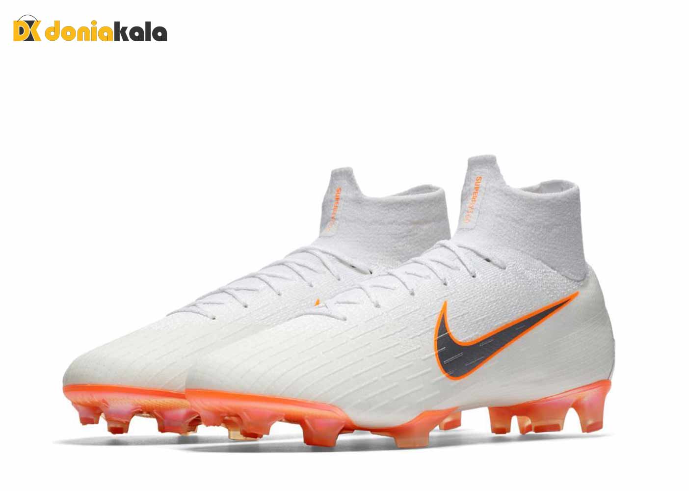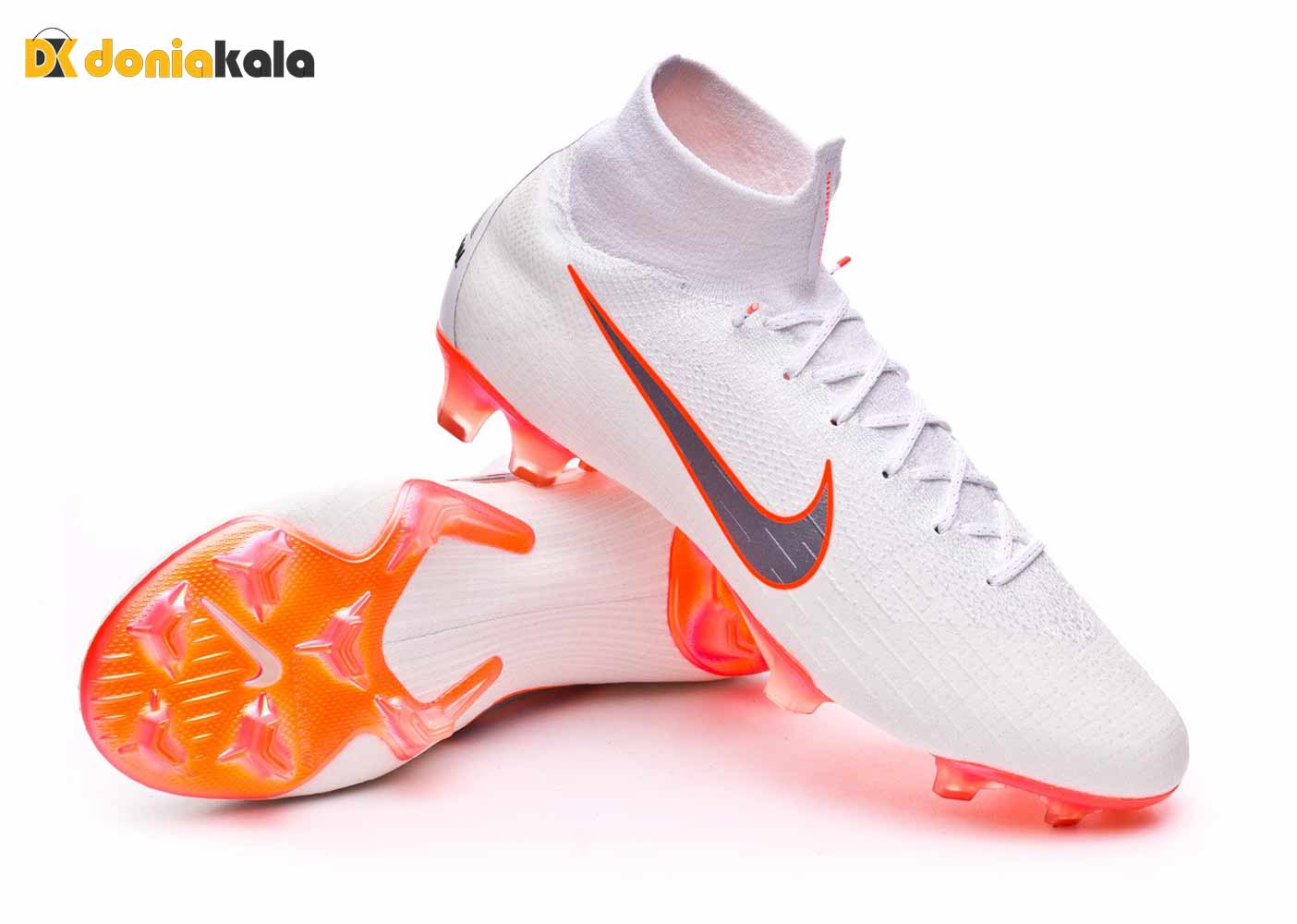 کفش فوتبال چمن طبیعی مردانه نایک مرکوریال سوپرفلای دارای یک سطح بالایی از Flyknit است که کاملاً دور پای شما را می پوشاند تا کاملاً پوششی مانند پوست دور پای شما باشد. flyknit یک قطعه بالایی یقه مانند است که مچ پای شما را مانند جورابی می پوشاند و از پیچ خوردن پا جلوگیری کرده، همچنین در تمرکز و سرعت بخشیدن هم بسیار کمک زیادی می کند. تکنولوژی این کفش اورجینال به طوری است که مهم نیست توپ با چه سرعت و شدتی به پای شما میخورد و یا در چه شرایط آب و هوایی هستید، رویه و کف آن حتما از پا و انگشتان شما محافظت میکند. وزن سبک و راحتی این کفش بسیار عالی بوده و ورزشکاران حرفه ای زیادی آن را پسندیده اند. استوک و یا میخ های زیر کفش دارای برامدگی ها ی استاندارد و مناسبی بوده و هرگز پا را اذیت نمیکند.