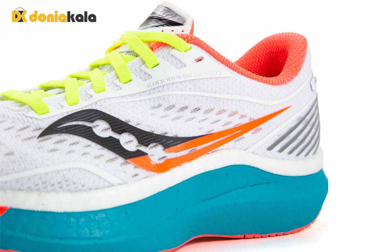 کتونی اسپرت ساکونی به شیوه ای طراحی شده است که در نورپردازی کم بهتر دیده خواهد شود و بازتاب خوبی از نور دارد. صاف، راحت و بالشتک. این کتونی سواری استثنایی را ارائه می دهد و این همه به لطف بالشتک سازی EVERUN و اولین ISOKNIT است که میانی کامل EVERUN برای بازگشت انرژی بیشتر است. زبانه ی آن از جنس مخمل می باشد و جنس رویه ی آن از الیاف مصنوعی می باشد و قابل تنفس برای پا در هوای گرم می باشد و در هوای گرم حسی خوبی بهت دست خواهد داد. زیره لاستیک کریستال TRI-FLEX با دوام بالا که امکان قابل جابجایی آسان را به کفش می دهد و همچنین باعث ضعیف شدن فشار وارده از طرف زمین به کفش می شود و دارای سیستم پاشنه گرید برای کوسن پاسخگو و بادوام و مانگاری است. مواد بیرونی این کتونی از لاستیک کربن XT-600 del است مقام بالایی در برابر سایش و کشش کفش دارد.کفش راحتی دویدن Saucony Endorphin Speed این کفش های مسابقه ای از مجموعه اندورفین برای مسافت های کوتاه سریع یا برای تمرینات سریع طراحی شده اند. قسمت بالایی FORMFIT تضمین می کند که پاها در جای خود قرار بگیرند و هنگام دویدن بیش از حد گرم نشوند.کف میانی مواد PWRRUN-PB از نوع جدیدی از کف ساخته شده است که با ذوب شدن دانه های کف کوچک در قالبی که شبیه به میانه کف است ، ساخته می شود. این ماده میزان بسیار بالایی از بازگشت انرژی را تضمین می کند.درست مانند Endorphin Shift ، Endorphin Speed نیز از فناوری Speedroll بهره می برد. Speedroll به شکل گرد کف پا و زیره هندسی است. این به تحریک انتقال پاشنه به انگشت کمک می کند.