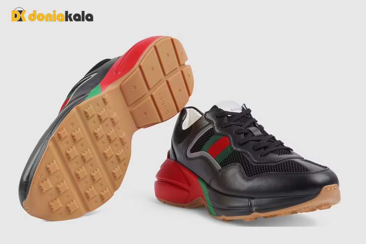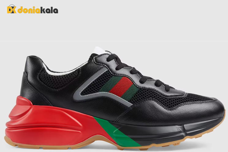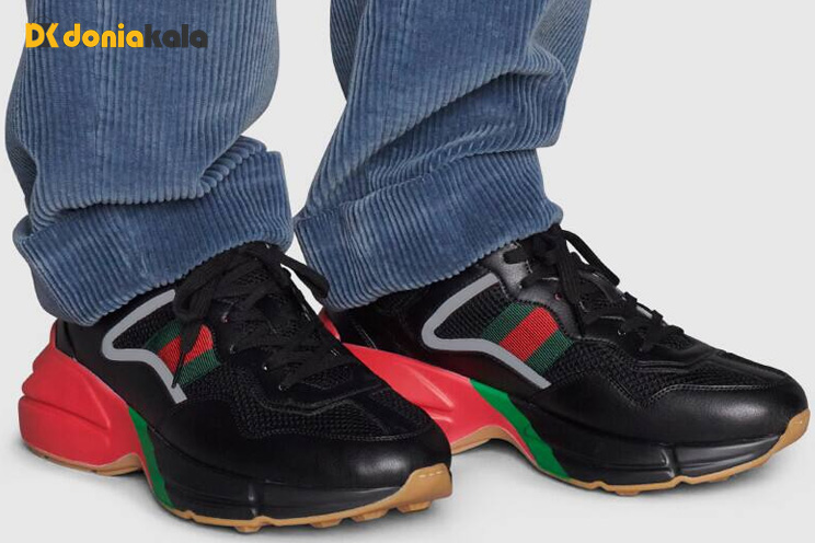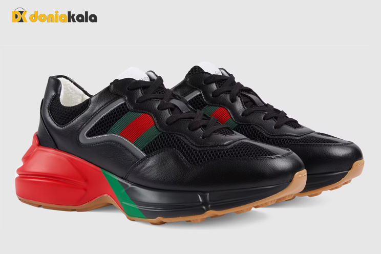 رایتون Rhyton که به دلیل زیره بزرگ و ساختار درشت خود شناخته شده است، اکنون اولین کار خود را با پارچه هایی با جلوه چرمی انجام می دهد. جزئیات: این کفش ورزشی گوچی ریتون مشکی از چرم، پارچه، مش و پارچه بازتابنده ساخته شده است. مجهز به بینی بادامی شکل، توری در بالا، نوارهای وب در کناره و نشان گوچی در پاشنه پا. بزرگ اجرا می شود، توصیه می کنیم یک اندازه کوچکتر بگیرید. ریتون Rhyton با زیره بزرگ و ساختار درشت آن قابل تشخیص است که در پارچه جلوه چرمی معرفی شده است.